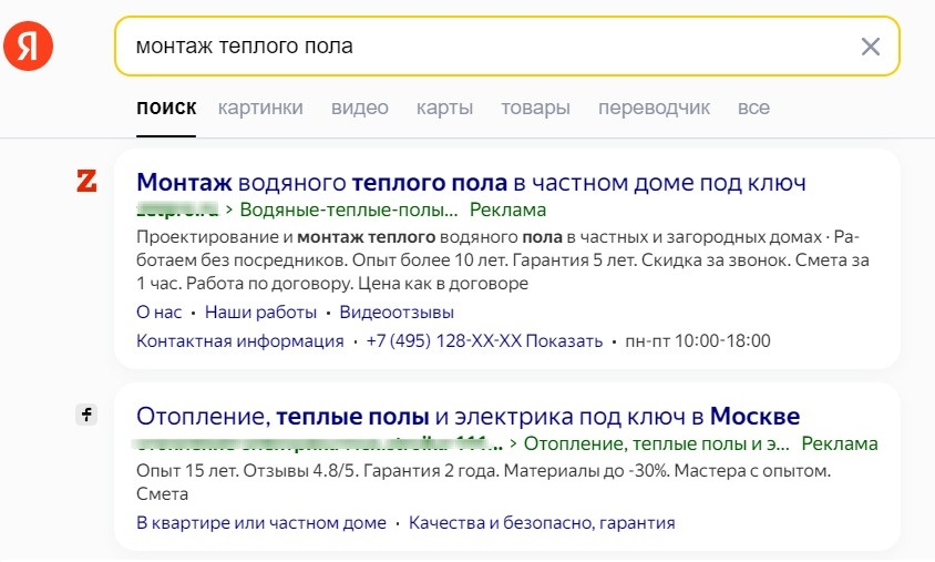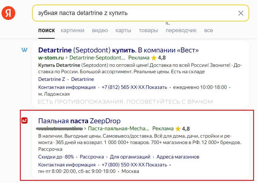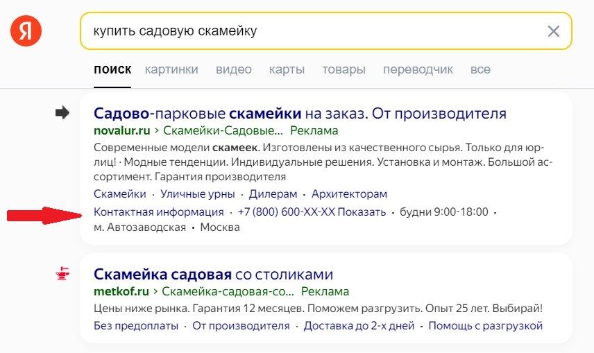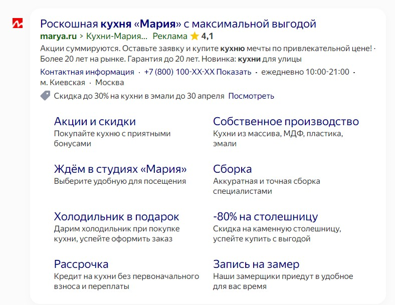 Сюда подтягиваются данные из карточки Яндекс Бизнеса. Контакты делают объявление более заметным за счёт дополнительной информации — телефона, времени работы. А еще сокращают путь клиента, так как прямо из объявления можно перейти на карточку организации.