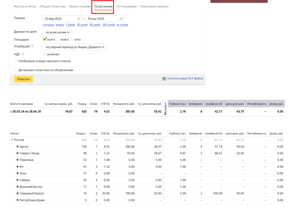 Если кампания работает в нескольких регионах, отслеживаем эффективность по разным областям и городам.