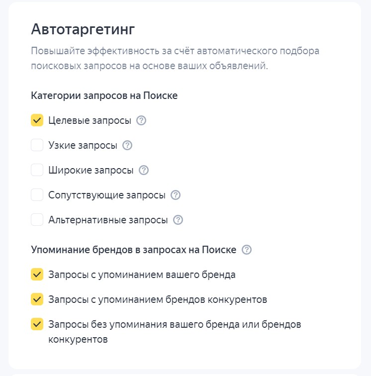 Сейчас автотаргетинг невозможно отключить в поисковых кампаниях. Нужно выбрать хотя бы одну категорию. На старте рекламы рекомендуют оставлять только «целевые запросы».