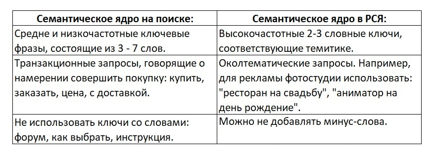 Семантика в контекстной рекламе во многом определяет успешность кампании. Проверьте, какого типа ключи используются. Например, у вас фирма по установке пластиковых окон. В поисковой кампании не должно быть широких ключей типа «пластиковые окна», а в РСЯ, наоборот, этот ключ допустим. Общие принципы подбора ключей — в таблице ниже: