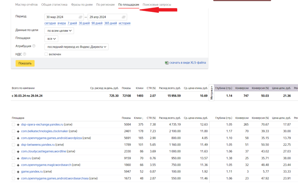 Переходим на вкладку «Площадки». Для кампаний в сетях смотрим, где много кликов, но нет конверсий, либо они очень дорогие.