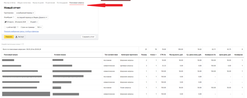 Для просмотра запросов, по которым показывались объявления, перейдите в отчётах на соответствующую вкладку.