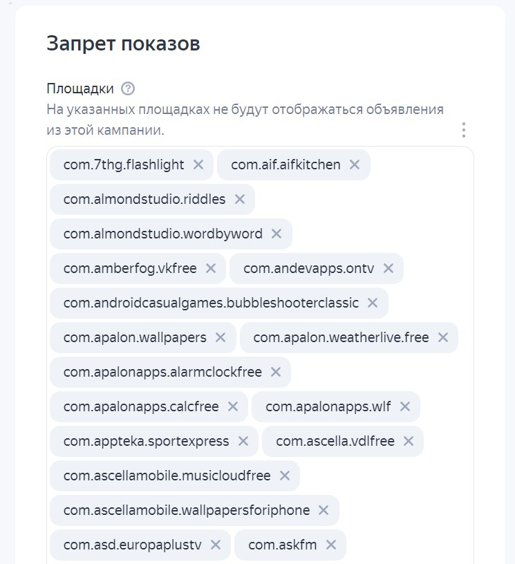 Настройка применяется для кампаний в РСЯ. На старте это поле может быть пустым. Если в работающей кампании нет запрещённых площадок, значит оптимизация не велась, и объявления показываются, в том числе, на неэффективных площадках, а значит часть бюджета тратится впустую.