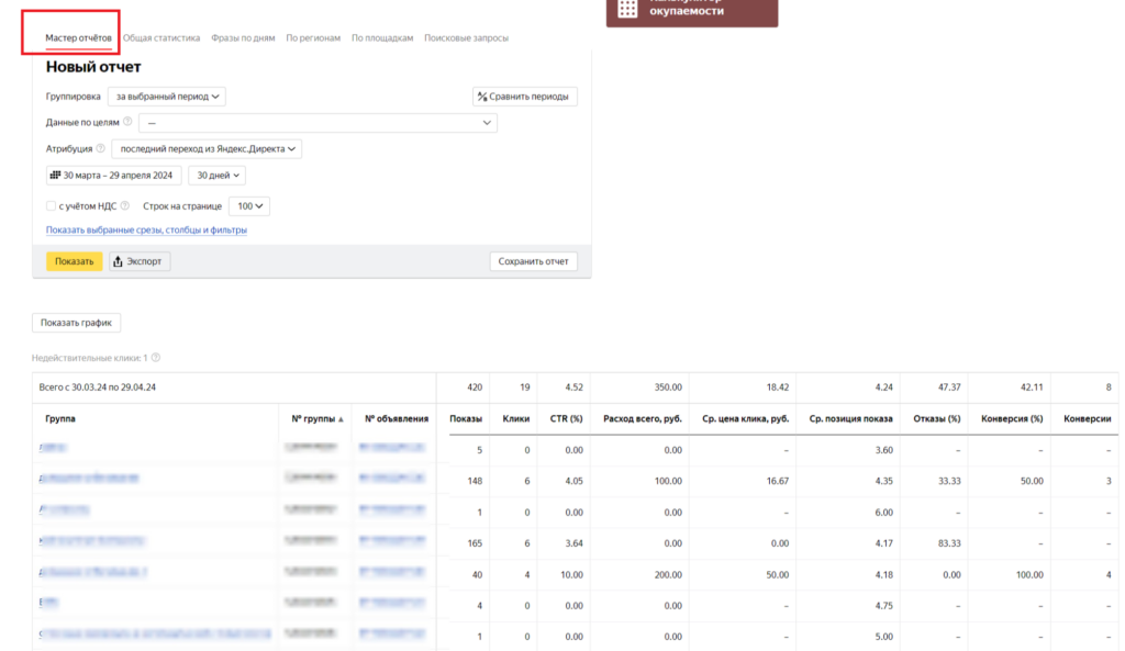 Смотрим данные по показам, кликам, конверсиям, расходу. Можно задавать нужные срезы, столбцы, фильтры.
