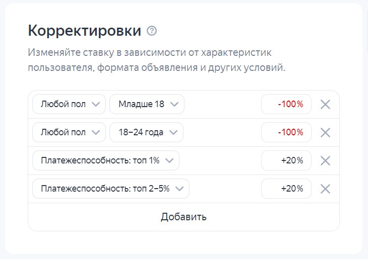 На старте кампании корректировок может не быть ни на уровне кампании, ни на уровне группы объявлений. Но если реклама работает некоторое время, а корректировки не добавлены, значит не было работ по оптимизации.