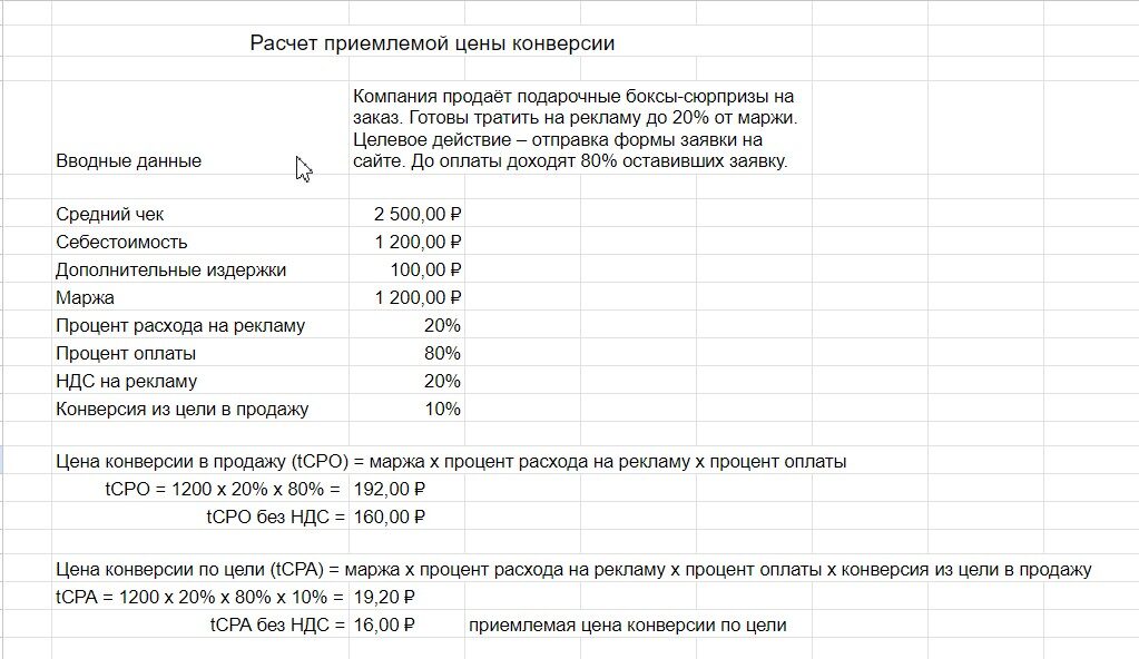 Посчитаем приемлемую цену конверсии tCPA по цели.