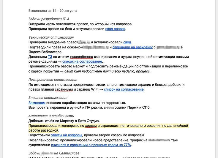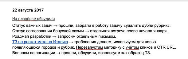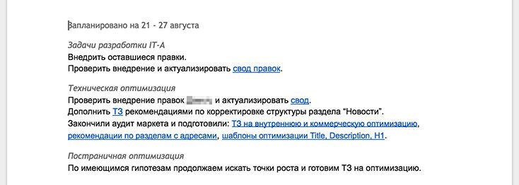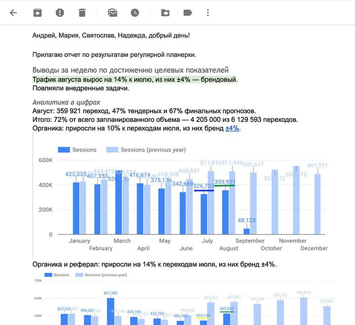 Дальше копируем отчёт из гуглдокса и отправляем его на почту всем участникам планёрки.
