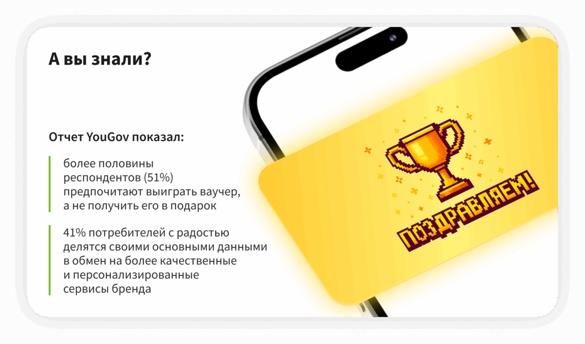 Будь то непосредственное удовольствие от выигрыша приза или ощущение того, что получаешь награды или привилегии за то, что являешься лояльным клиентом, геймификация активирует естественное желание получать вознаграждение за свои усилия.