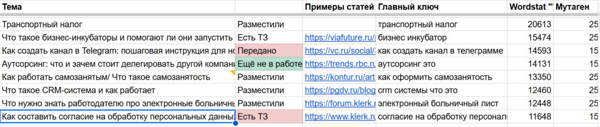 За каждой темой фиксируем формат статьи, топового конкурента, главный ключ, частотность и конкурентность