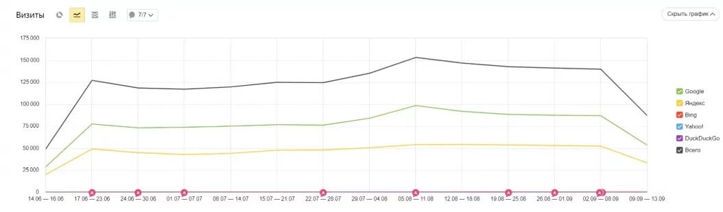 В рамках ежемесячных отчетов на проектах мы оцениваем трафик и метрики качества контента (в Яндекс Метрике и Google Analytics), видимость и позиции (в Топвизоре).