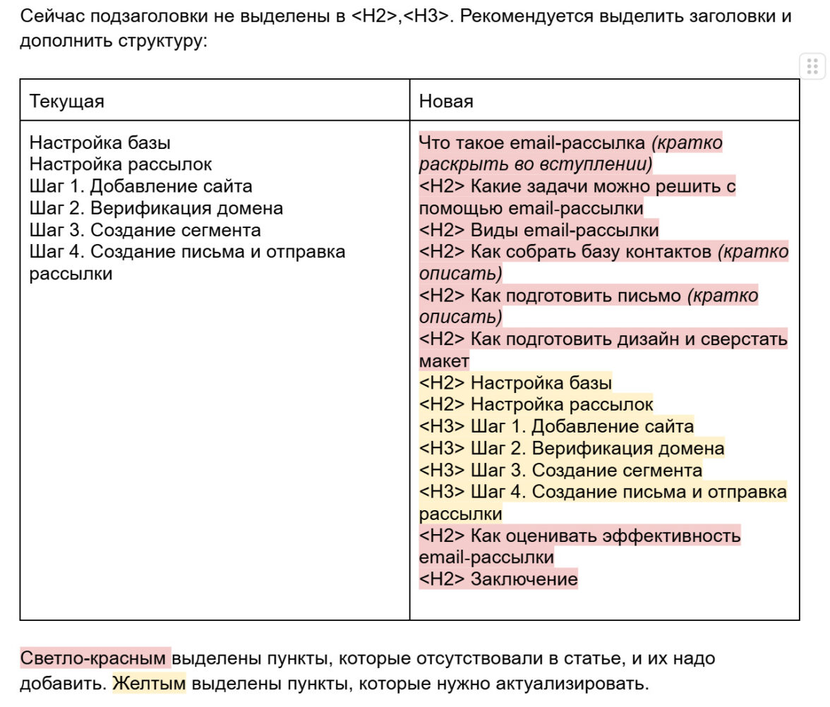 Подробный структурный план статьи ― самая важная часть, составляется на основе топа статей конкурентов.