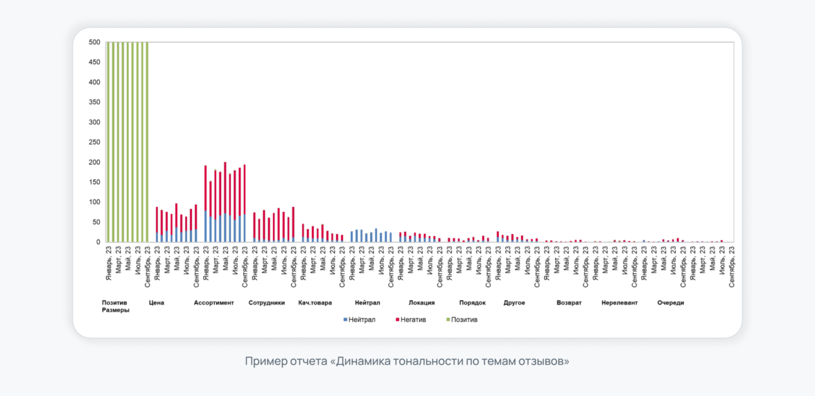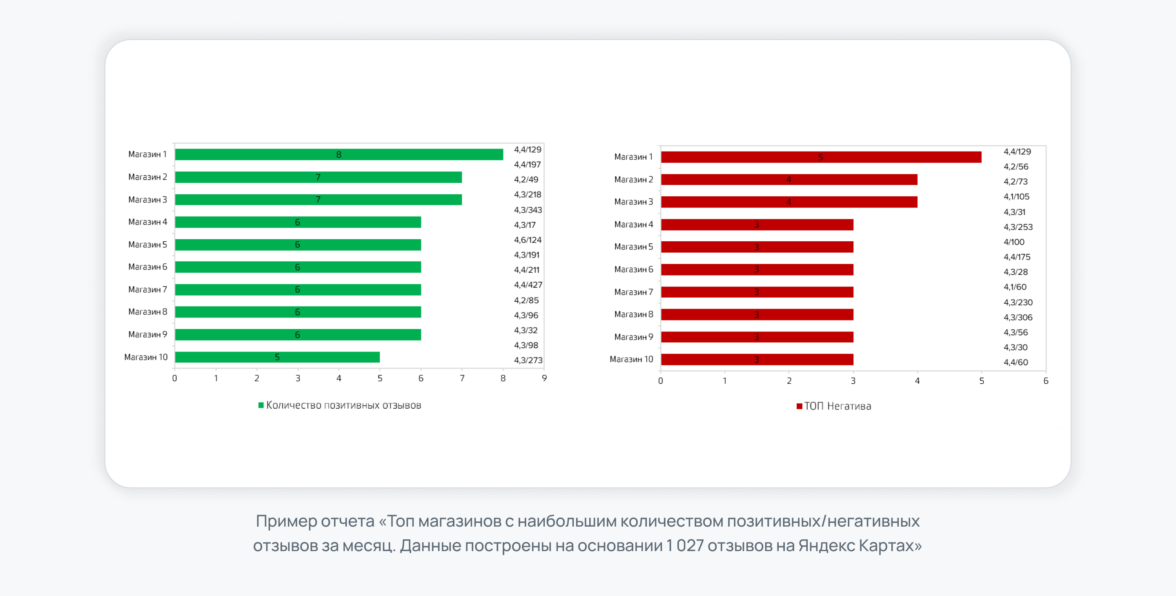 Отдел развития розницы получал сегментированный отчет по обратной связи покупателей, а также поинты с точками роста по конкретным магазинам. Важной частью этой работы было выявление на ежемесячной основе списков лучших и худших магазинов по определенным критериям (динамика рейтингов, динамика негативной обратной связи за месяц и так далее).
