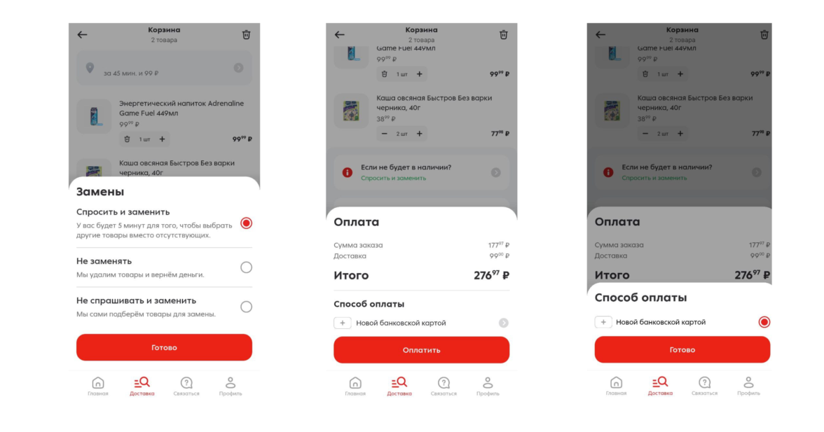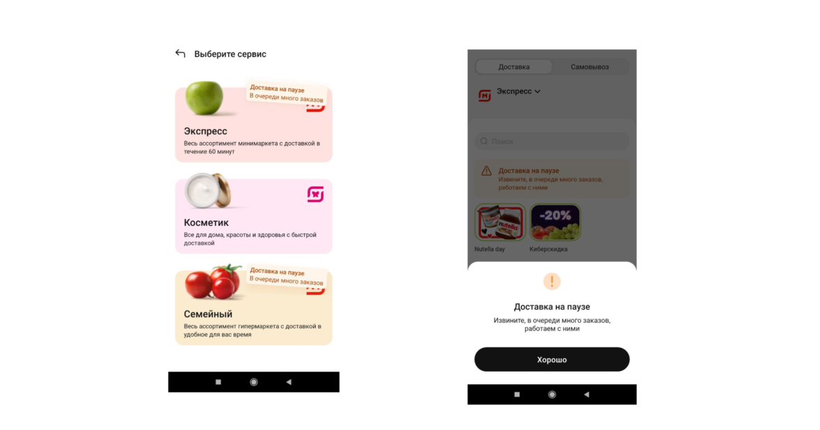 Связность и единообразие текстов. Когда доставка перегружена, об этом появляется сообщение «Доставка на паузе. В очереди много заказов». По сути это проблема: пользователь не хочет идти в магазин и стоять в очередях, но в приложении он сталкивается с ними же. Только тут не позовешь еще одного кассира. В сообщениях об ошибках или проблемах важно объяснять, что делать покупателям и когда им ждать решения.