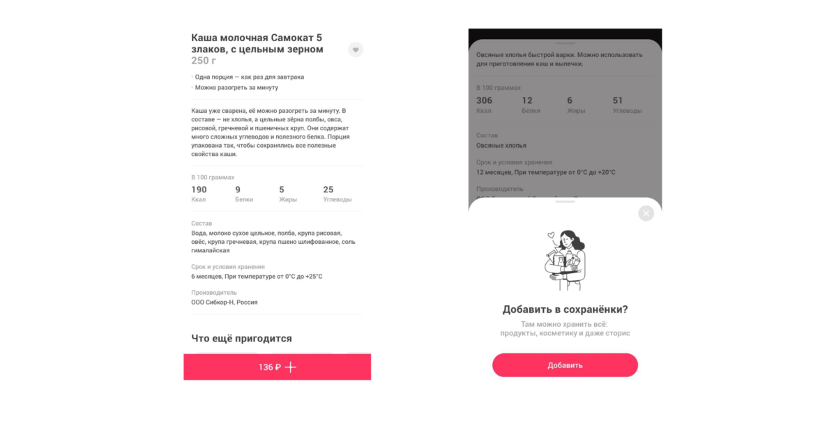 Связность и единообразие текстов. У Самоката продуманный Tone of voice, которого придерживается текст в приложении. Например, Самокат, как хороший друг, заботится о пользователях и рассказывает, как приготовить кашу, какой в ней состав, предлагает выбрать что-то ещё. Приложение знает свою аудиторию, «говорит» на языке пользователей с помощью понятных им терминов и не боится использовать слова «Сохранёнки» и «Сторис».
