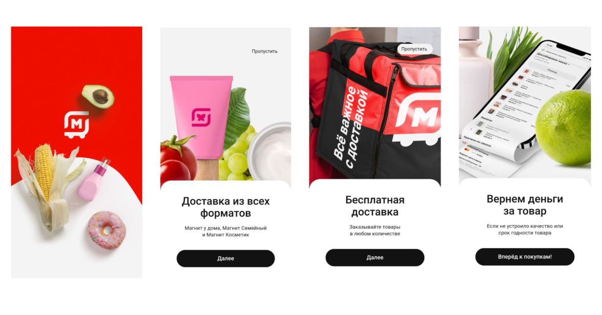 Например, на первых двух, заголовки обезличены и скорее просто перечисляют функции. А на последнем — появляются некие «мы», которые вернут деньги. Еще сходу может быть непонятно, что такое форматы. Возможно формулировка «Доставка из всех магазинов Магнит» была бы понятнее.