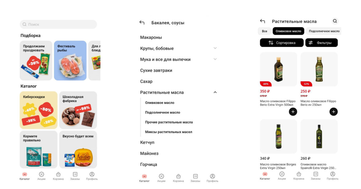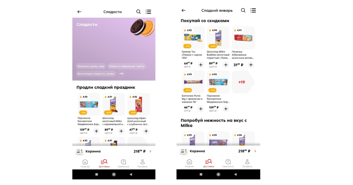 Удобство поиска и когнитивная нагрузка. На главном экране есть сторис для вдохновения, например, «Что заказать к чаю» и «Чем заняться с детьми», и много категорий товаров.