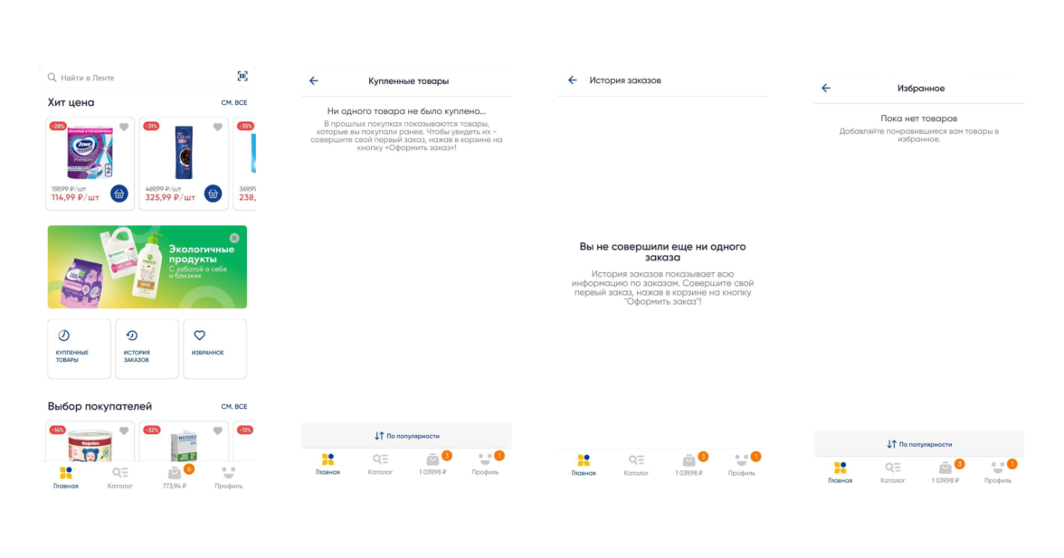 Связность и единообразие текстов. На главной в Лента Онлайн пользователи могут посмотреть, что покупали, какие заказы делали и что отложили в избранное. Когда этих данных нет, появляются пустые состояния и не очень содержательные тексты. Например, фраза «История заказов показывает всю информацию по заказам» занимает место, но повторяет сама себя.