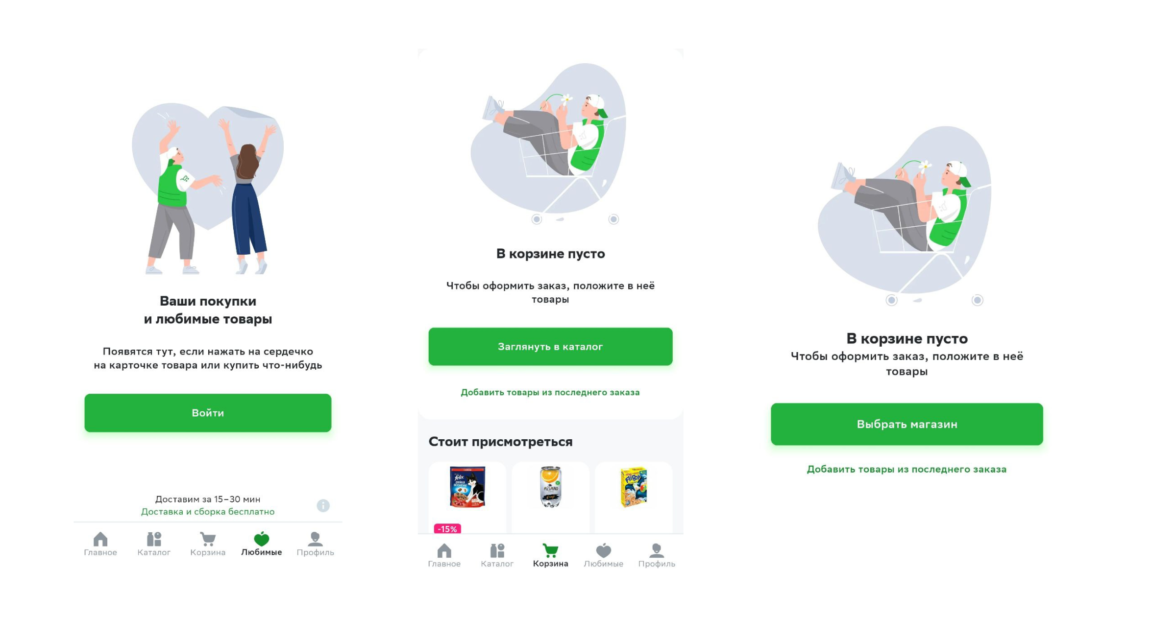 Ребята работают с пустыми состояниями. Например, объясняют, что может быть в разделе «Любимые», если зарегистрироваться или войти в профиль и купить что-нибудь. И учитывают флоу пользователей — меняют текст кнопки в пустой корзине для пользователей. Те, кто уже находится в каталоге магазина видят кнопку «Заглянуть в каталог», а кто ещё не выбрал магазин — «Выбрать магазин».