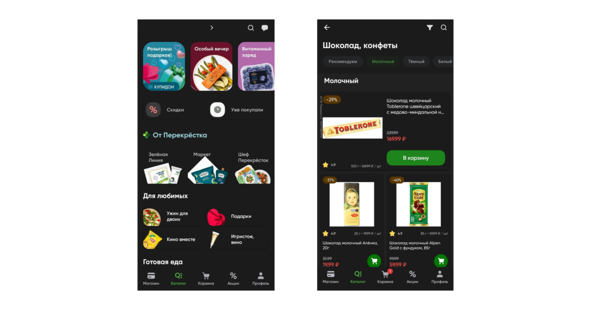 Удобство поиска и когнитивная нагрузка. В приложении Перекрёстка есть категории под разные поводы. Например, для просмотра кино или ужина на двоих. Такие категории могут мотивировать зайти в них, если у пользователей есть подобные планы на вечер. Остальные категории тоже названы понятно и вряд ли запутают пользователей.