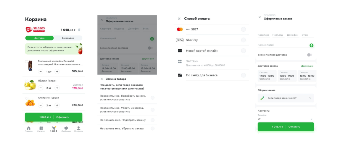 Решение задачи. Когда пользователи зарегистрированы и добавили товары в корзину, остается выбрать временной интервал, что делать, если товар в магазине закончился и способ оплаты. Здесь минимум текста, он понятен и просто воспринимается.