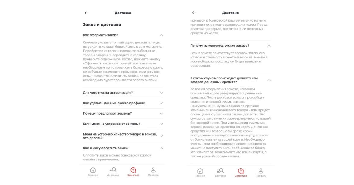 У Пятёрочки есть раздел с ответами на популярные вопросы, это удобно, потому что пользователи могут найти ответ на свой вопрос и не обращаться в поддержку. Но не все ответы легко читаются. Например, на вопрос «Как оформить заказ?», ответ в двух предложениях, одно из которых было бы здорово разделить на буллиты.