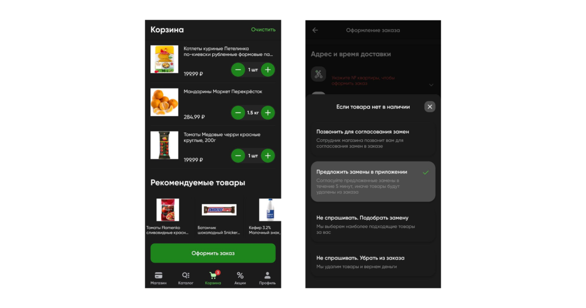 Решение задачи. На этапе оформления заказа Пятёрочка предлагает выбрать, что делать, если товара нет. Это хорошее решение, если компания знает, что бывают ситуации, когда товара может не оказаться, хотя он доступен к заказу.