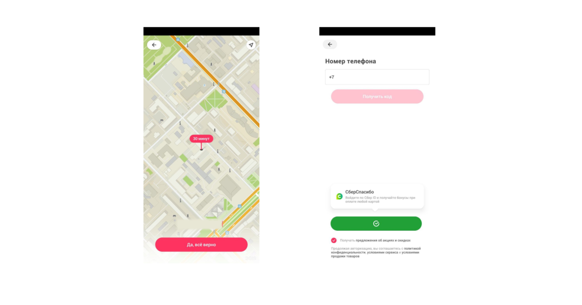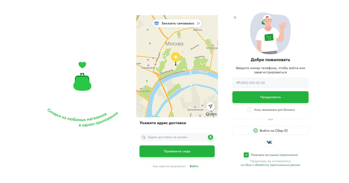 Регистрация. При первом входе, приложение, предлагает выбрать адрес, ввести номер телефона или войти через Сбер ID. Текста на экранах не много, но его достаточно, чтобы понять, что нужно сделать, чтобы зарегистрироваться.