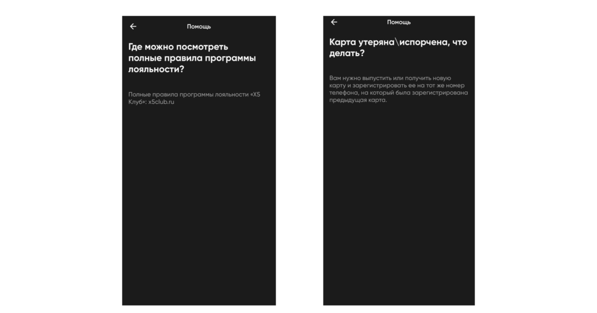 Связность и единообразие текстов. В разделе «Помощь» тексты призваны помогать пользователям. Ответы на некоторые вопросы в Перекрёстке с этим справляются немного хуже, чем хотелось бы. Было бы здорово сделать их подробнее. Например, дать кликабельную ссылку на правила программы лояльности, чтобы пользователям не пришлось вбивать его руками. Или не только рассказать, что потерянную карту нужно выпустить повторно и зарегистрировать на старый номер. Но и подсказать, где это можно сделать: в любом магазине рядом с домом, через поддержку или на сайте.