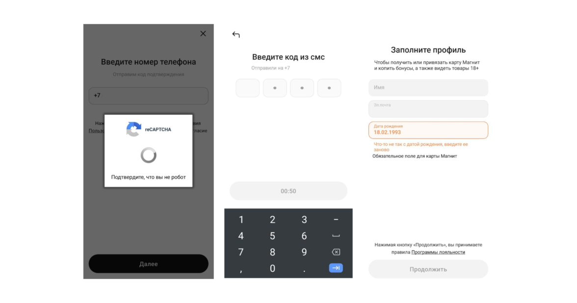 После ввода кода наступает время заполнить профиль. Приложение объясняет: это нужно, чтобы получить или привязать карту Магнит, копить бонусы, видеть товары 18+. Шанса пропустить этот шаг и вернуться к нему позже нет, потому что все поля обязательные, хотя приложение предупреждает только об одном обязательном поле с датой рождения. При его заполнении может возникнуть ошибка, текст в приложении не объясняет почему, и просто просит еще раз ввести данные.