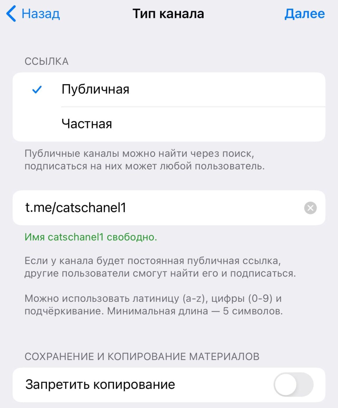3. Выбираем тип — закрытый или открытый телеграмм канал. Для первого варианта мессенджер предложит вариант ссылки автоматически, а для второго придётся придумать свою версию. Причём здесь сразу происходит проверка на повторы. Если название может дублироваться, то ссылка на телеграм канал не повторяется и содержит от 5 до 32 латинских символов или цифр.