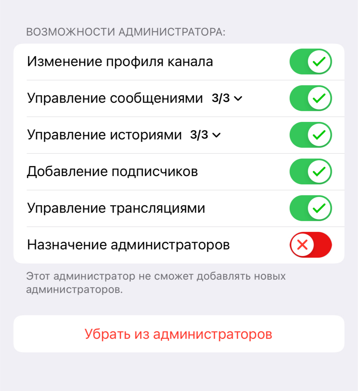 Для совместного ведения вы можете предоставить доступ другим людям. Права администратора устанавливаются в настройках — это возможность или невозможность менять профиль канала, управление сообщениями, историями и трансляциями, добавление подписчиков и назначение других администраторов.