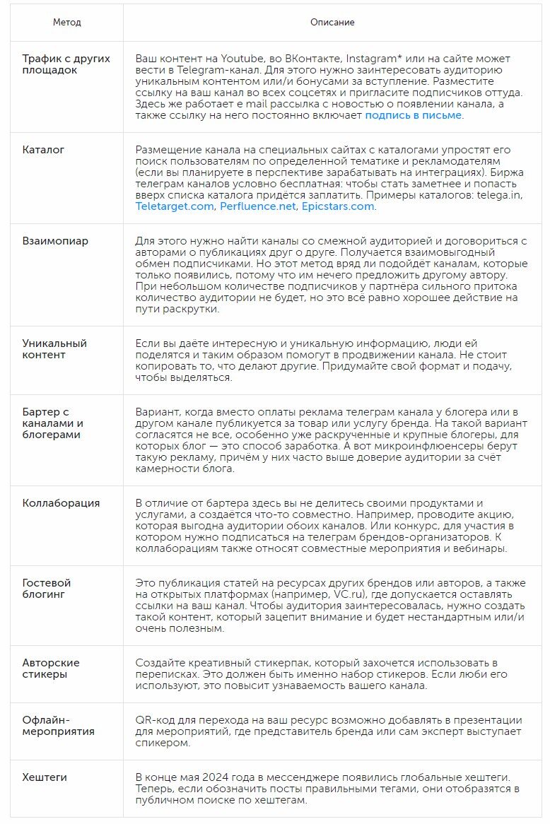 Как рекламировать телеграм канал бесплатно: привлекать аудиторию с других площадок, использовать емайл рассылки, устраивать коллаборации, предлагать бартерное размещение и взаимопиар, писать статьи в других блогах, а также создавать уникальный контент, креативные стикеры. Платные методы раскрутки канала — это реклама у блогеров, в других каналах, Telegram Ads, публикации в СМИ и QR-коды на офлайн-площадках.