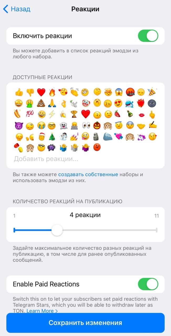 Подключены автоматически с максимальным количество эмоджи на один пост (11). Возможно выставить ограничения или вообще отключить реакции. Также доступно добавление кастомных эмодзи.