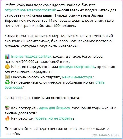 Важность открытого упоминания вашего канала в статье. Поскольку такой формат не является нативным, вам нужно активно рекламировать канал в тексте. Например, размещение в подборках, таких как «Лучшие Telegram-каналы России», работает особенно эффективно, так как привлекает внимание людей, которые ищут новые каналы для подписки.