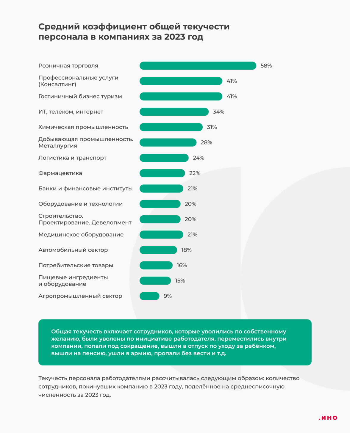 Например, в 2023 году рекрутинговое агентство Antal Talent провело исследование, в ходе которого был определён средний коэффициент текучести в различных нишах.