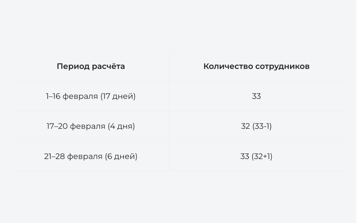 Пример расчёта за месяц. На 01.02.2023 г. в организации 35 работников. Двое из них работают неполный рабочий день — в феврале у них получилось в сумме 203 рабочих часа. С 17 февраля одна постоянная работница ушла в декрет, 21 февраля на её место принята другая. Всего феврале 2023 г. 143 рабочих часа.