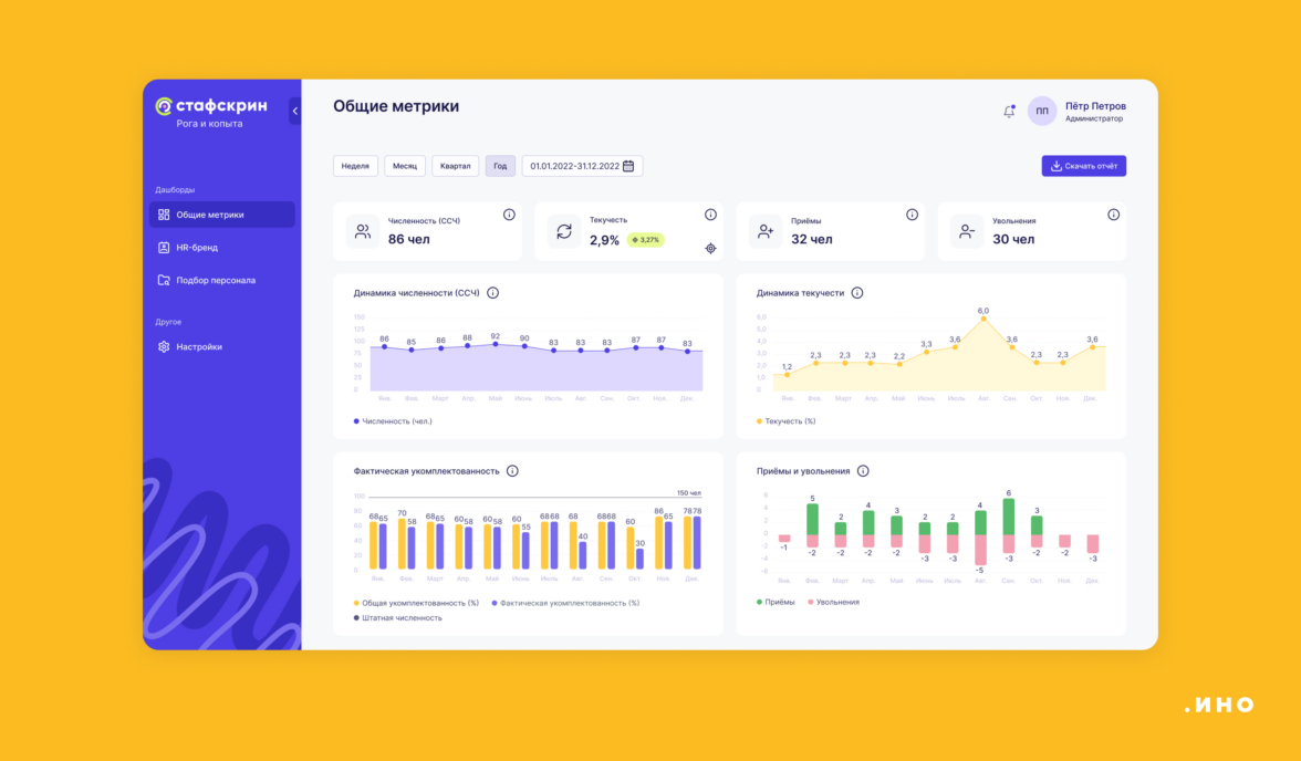 Регулярно оценивать эффективность кадровой политики. Система оценки позволит вовремя реагировать на возникающие проблемы и справляться с высокой текучкой кадров. Вручную рассчитывать показатели трудоёмко, поэтому лучше использовать платформы HR-аналитики — например Стафскрин. Она помогает автоматизировать сбор данных из других HR-сервисов и рассчитывать метрики по ключевым процессам.