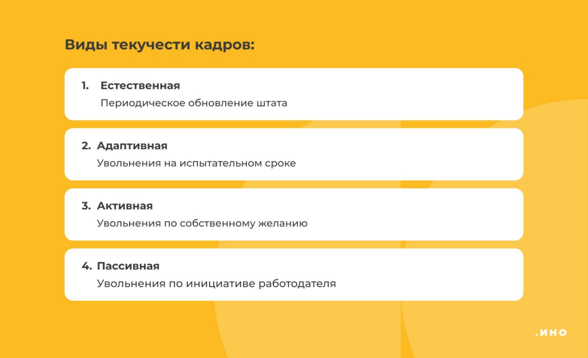 Естественная. В любой компании происходит периодическое обновление штата. Одни сотрудники находят новое место работы, другие — уходят на пенсию, а им на замену приходят другие талантливые специалисты. Такая смена кадров не приносит убытков и положительно влияет на компанию. Свежий взгляд новых сотрудников помогает переосмыслить бизнес-процессы, оптимизировать их и улучшить финансовые показатели.