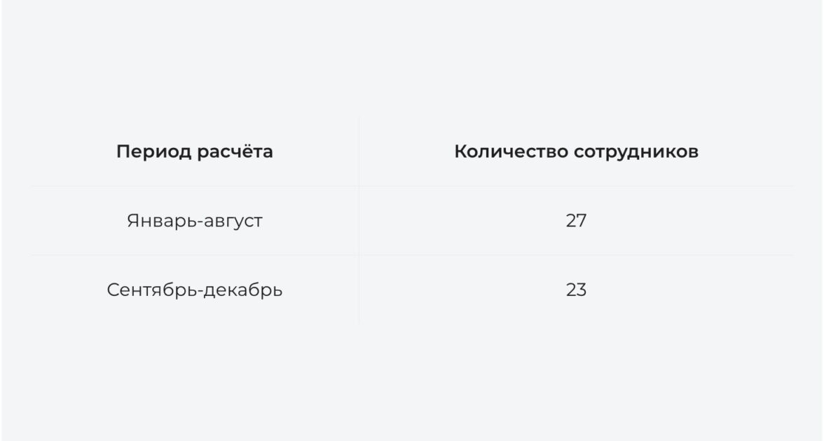 ССЧ за год = (27 чел. × 8 мес. + 23 чел. × 4 мес.) / 12 мес. = 25,67 чел.