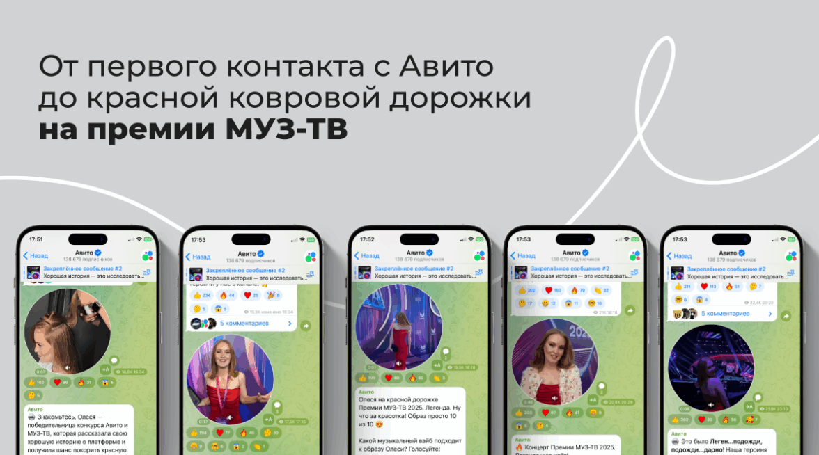 В этом проекте мы синхронизировали диджитал-инструменты Авито с медиасредой МУЗ-ТВ: Telegram-бот с интерактивной механикой, кампании в соцсетях МУЗ-ТВ и поддержку в диджитал-форматах. Такой микс дал нам высокий охват и качественную вовлеченность аудитории, собрав сотни историй для конкурса. Финал тоже был яркий: победительница начала с хорошей истории, связанной с Авито и рассказанной в чат-боте, а потом оказалась на красной ковровой дорожке легендарной премии МУЗ-ТВ.Это стало крутым примером того, как диджитал-активация может трансформироваться в уникальный офлайн-опыт и усиливать бренд-эмоцию, ведь весь образ мы собрали со стилистом при помощи Авито и помогли случиться еще одной хорошей истории. Наш Telegram-канал превратился в лайф-трансляцию подготовки и участия в премии нашей победительницы, что помогло пользователям тоже погрузиться в эту атмосферу.