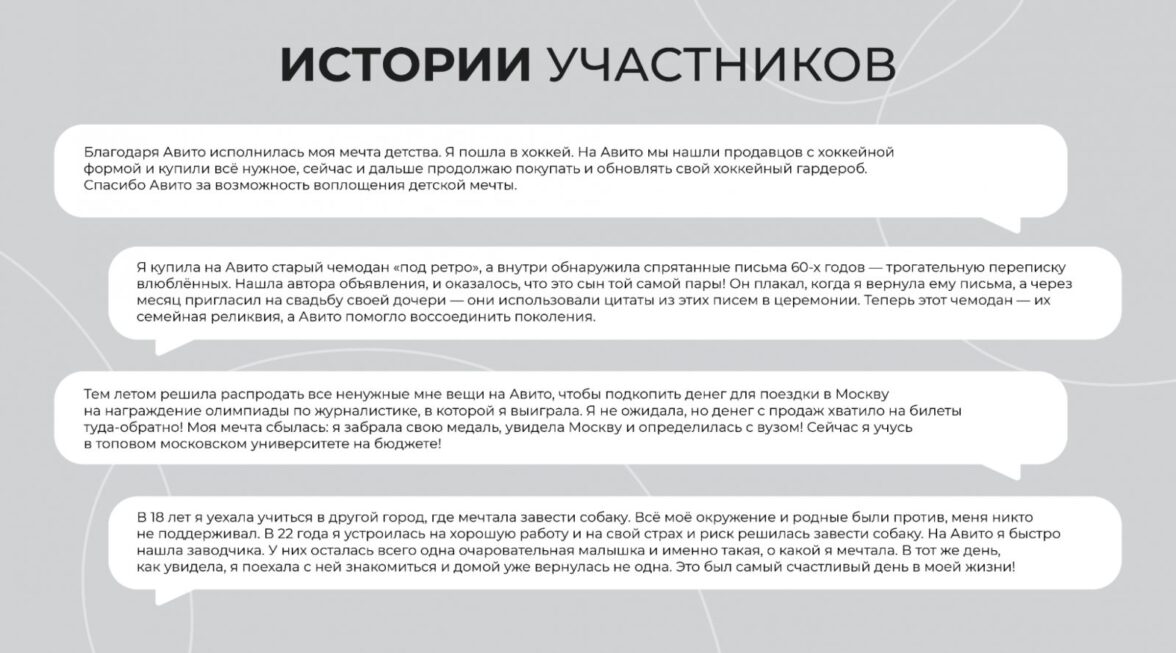 «Однажды, пытаясь продать старую видеокамеру на Авито, я нашла внутри детские записи с моими смелыми мечтами стать видеоблогером, и эти кадры разбудили забытые чувства и цели. Камера обрела новую хозяйку — девушку, мечтающую о видеосъемке, а я, вдохновившись, решила вернуться к детским мечтам и поступила на телерадиоведущую. Авито стало для меня не просто площадкой объявлений, но местом, где началось новое путешествие и обретение себя», — написала Олеся в чат-боте конкурса.