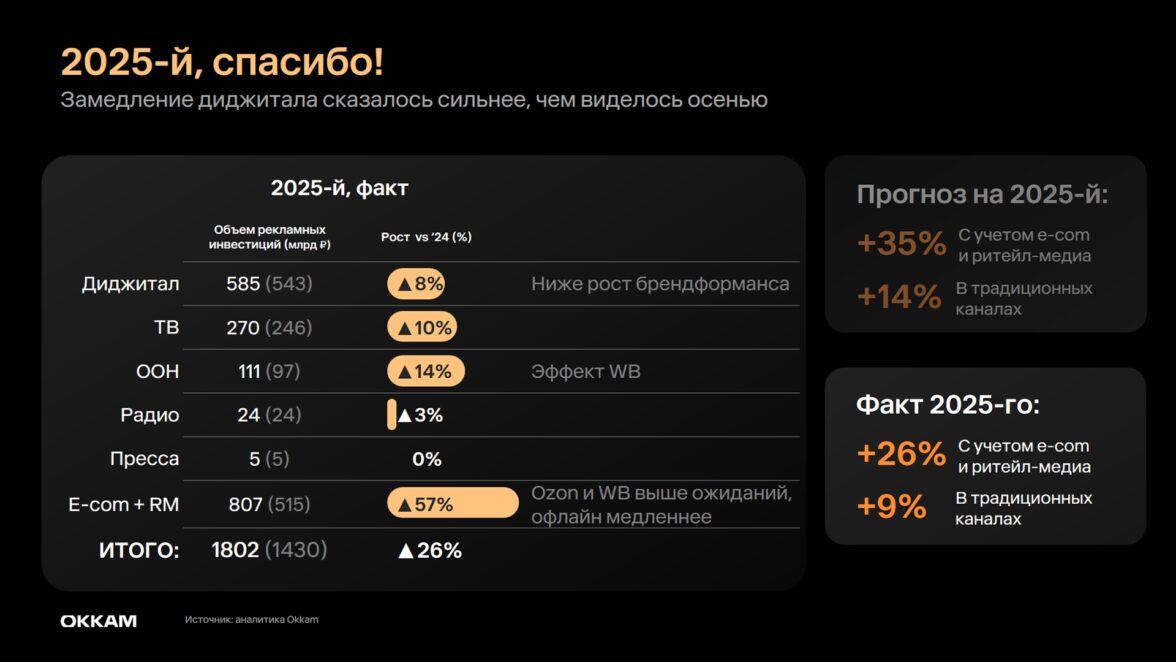 Прогноз Okkam от сентября прошлого года предполагал, что рекламный рынок в целом вырастет сильнее, на 35%. Замедление диджитала повлияло сильнее, чем виделось осенью, объясняет Дарья Куркина: инвестиции в диджитал показали рост только на 8%, до 585 млрд рублей.