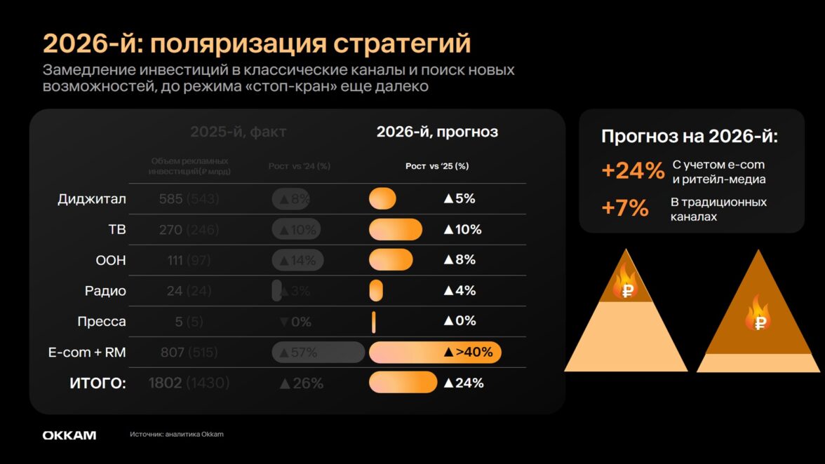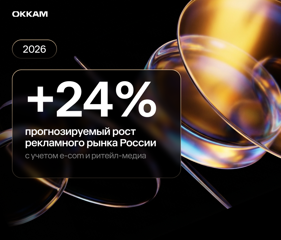 Дарья Куркина также представила обновленный прогноз Okkam на 2026 год. Группа ожидает, что в текущем году рост рынка в целом замедлится до 24% с учетом рекламы в e-com и ритейл-медиа и до 7% в традиционных каналах. В совокупности расходы брендов на продвижение преодолеют отметку в 2 трлн рублей.
