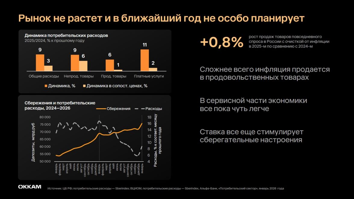 В 2026 году рынок ждет замедление инвестиций в классические каналы и поиск новых возможностей, потому что рынок в гражданской части экономики «не растет и в ближайший год не особо планирует», по словам Дарьи Куркиной. Если анализировать потребление без учета инфляции (сравнивать продажи товаров в сопоставимых ценах), то видно, что потребители не наращивают расходы, и особенно сильно это сказывается на сегменте продовольственных товаров. Так, рост продаж товаров повседневного спроса в России с очисткой от инфляции в 2025-м по сравнению с 2024-м составил только 0,8%. В сервисной части экономики рост пока сохраняется (11,3%), однако его природа преимущественно инфляционная. Медленное снижение ключевой ставки ЦБ РФ все еще стимулирует россиян больше сберегать, и момент возвращения средств с депозитов в товарное потребление пока откладывается.