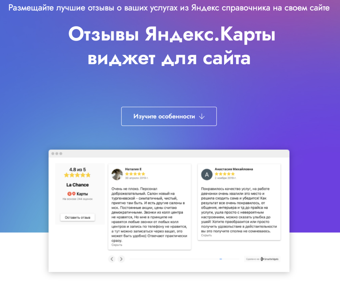 SmartWidgets позволяет быстро и легко интегрировать реальные отзывы с Яндекс.Карт на сайт.