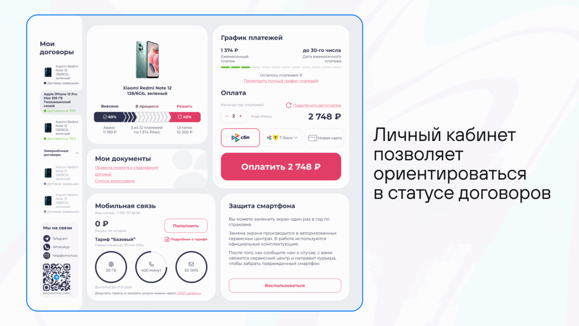 Smarta — это новый способ владеть смартфоном: клиент платит 60–70% стоимости сейчас, а через 1–2 года решает — доплатить остаток или сдать устройство обратно. При этом сервис «наследует» логику интернет-магазина, в нем есть каталог, фильтры, оформление заказа, личный кабинет.