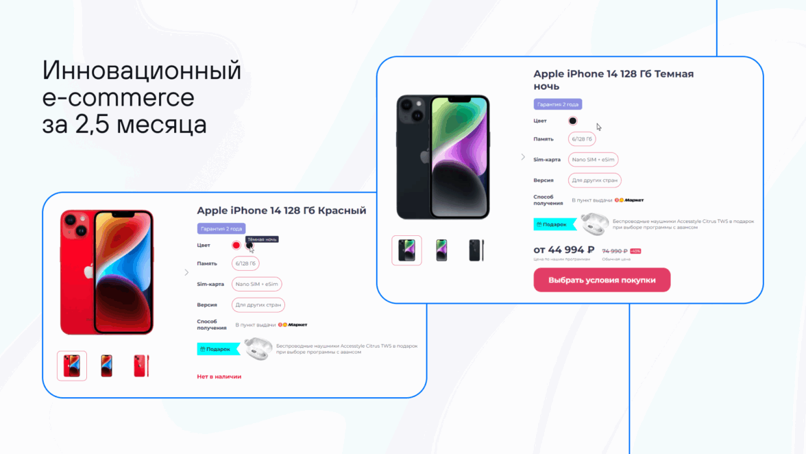 Одним из ключевых элементов стала карточка товара со сложной логикой отображения. Благодаря ей пользователь может просмотреть весь модельный ряд смартфона на одной странице, переключая опции — цвет, объем памяти, комплектацию и другие параметры.
