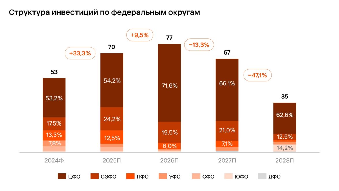 Объем инвестиций в отрасль в 2025 году составит 70 млрд рублей, что на 33% больше, чем в 2024-м. Пик финансового потока придется на 2026 год, когда объем вложений составит 77 млрд рублей. Далее, с учетом текущих планов, к 2028 году аналитики ожидают сокращения инвестиций примерно на 30%, до 35 млрд рублей. Наиболее стремительный отток ожидается в 2028 году ввиду ввода в эксплуатацию капиталоемких проектов Центрального и Северо-Западного федеральных округов.