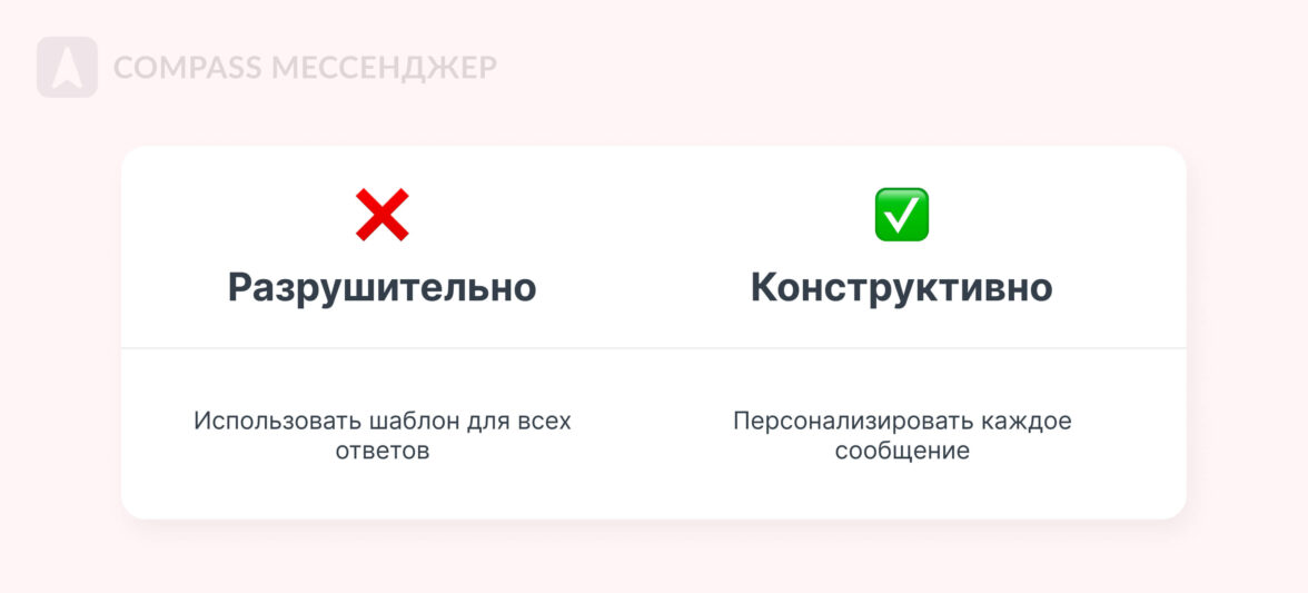Одинаковые ответы создают ощущение, что компания не видит в клиентах людей. Гораздо лучше иметь инструкции по типам отзывов, но всегда формировать персональный ответ. Чем больше эмоций вложено в отзыв, тем личнее должен быть отклик.