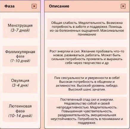 По табличке ниже можно понять, в какую фазу чем лучше заниматься. Отследить свой цикл можно в любом приложении, например во FLO. Как-нибудь во время фолликулярной фазы, я напишу подробный гайд о такой технике планирования графика.